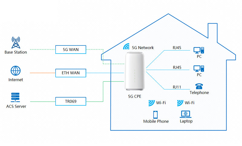 ✔ FiberHome 5G CPE products are suitable for places without fiber deployment. FiberHome 5G CPE products have two types, indoor and outdoor. Indoor 5G CPE supports 5G and ethernet cable uplink, and downlink can provide wired and wireless coverage for families. It is convenient and flexible to operate the functions of indoor environment, family security, family health, family networking.